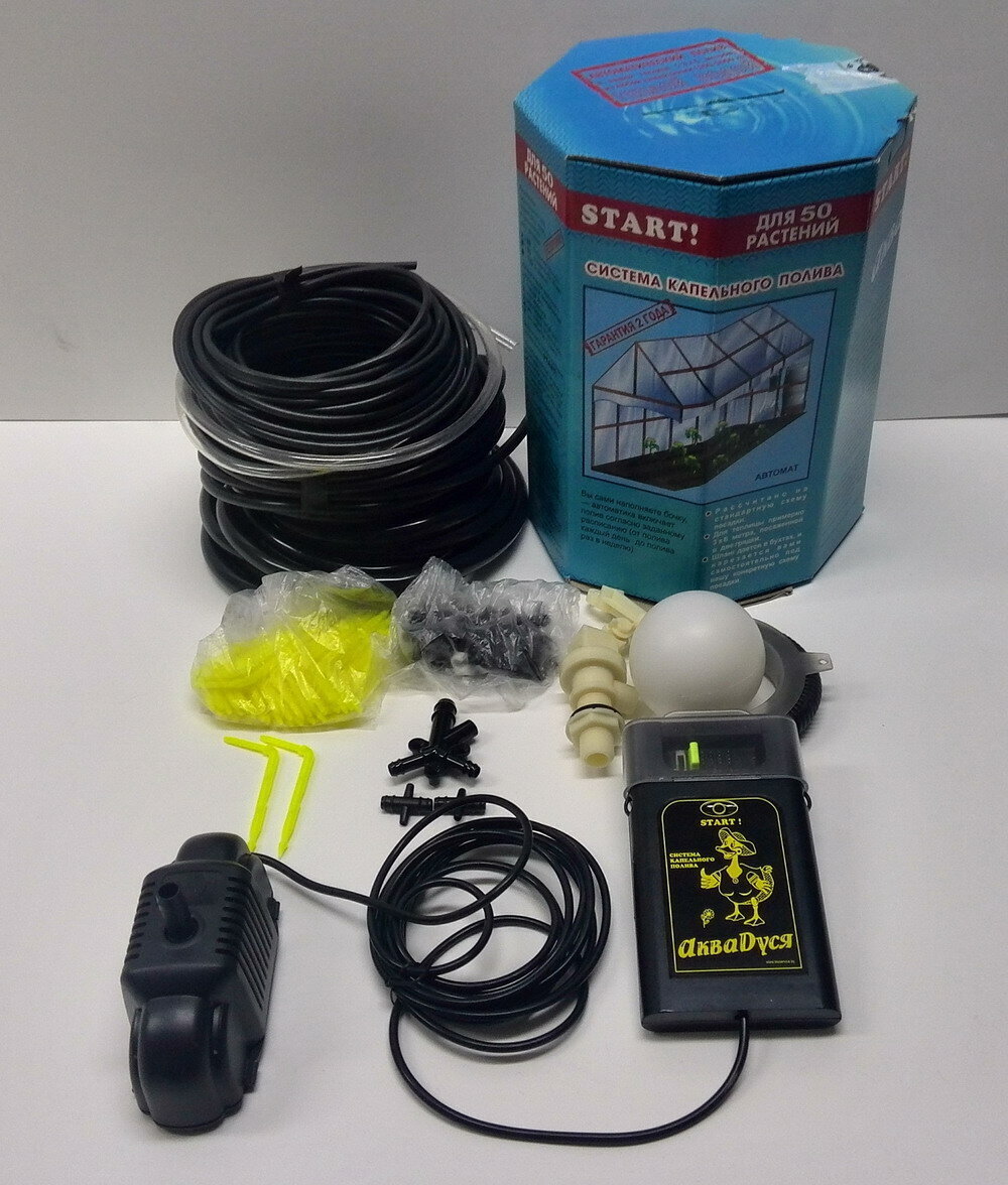 Комплект системы капельного полива Аква-Дуся +50 START рассчитан на полив 50 растений и включает в себя: - Блок управления, работающий на 8 батарейках в течении всего сезона, - Реверсивный насос, начинающий полив и отключающий его, - 50 капельниц с продольными щелевыми отверстиями, что позволяет производить полив в прикорневой зоне и предотвращает засорение, - Комплект шлангов черного цвета, что способствует солнечному нагреву воды в них и исключает зацветание, - Соединительные элементы. Универсальность системы полива Аква-Дуся обеспечивается тем, что шланги Вы нарезаете сами, в зависимости от схемы посадки.