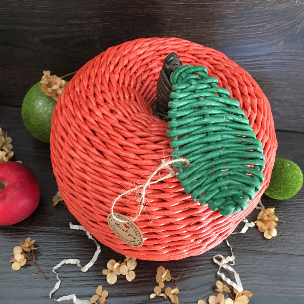 Плетеное «Яблоко» изготовлено вручную из бумажной лозы и покрыто нетоксичным акриловым лаком. Может использоваться, например, на кухне для хранения конфет, орехов, сладостей или как коробочка для мелочей. Изделие очень прочное, легкое, долговечное и за ним легко ухаживать.