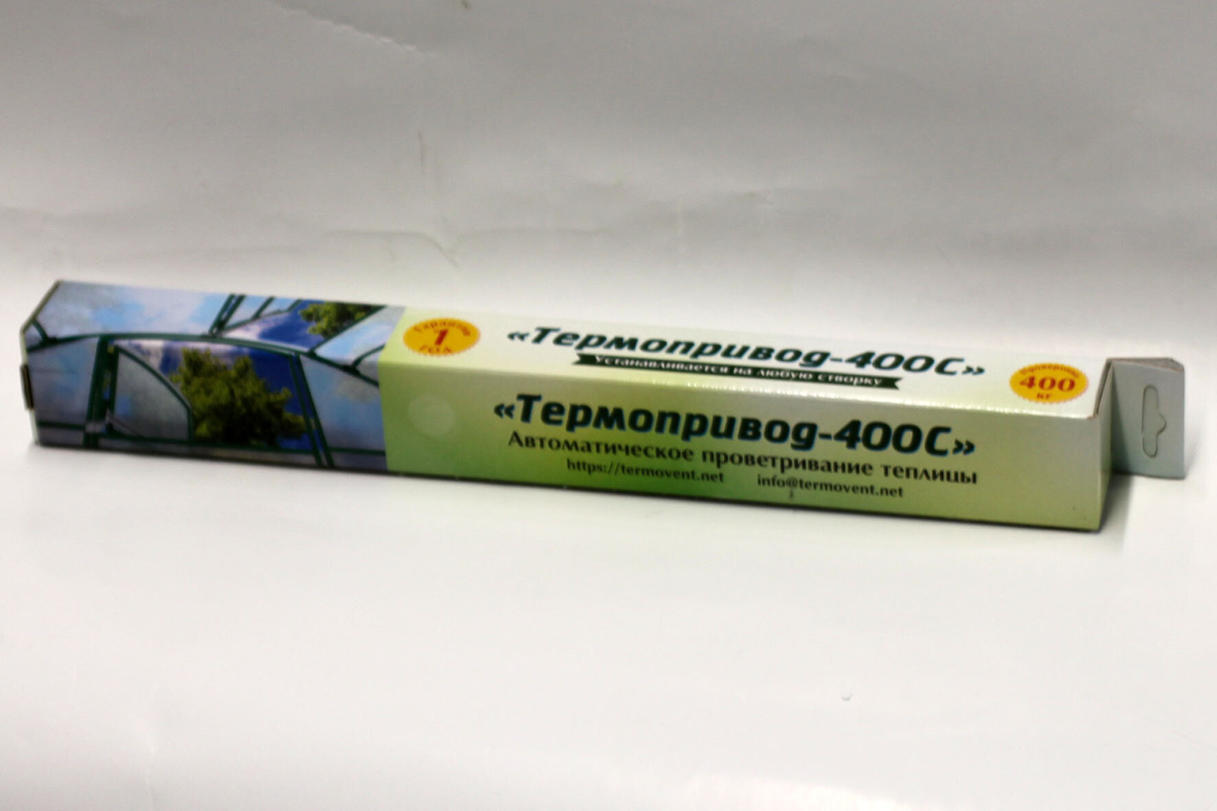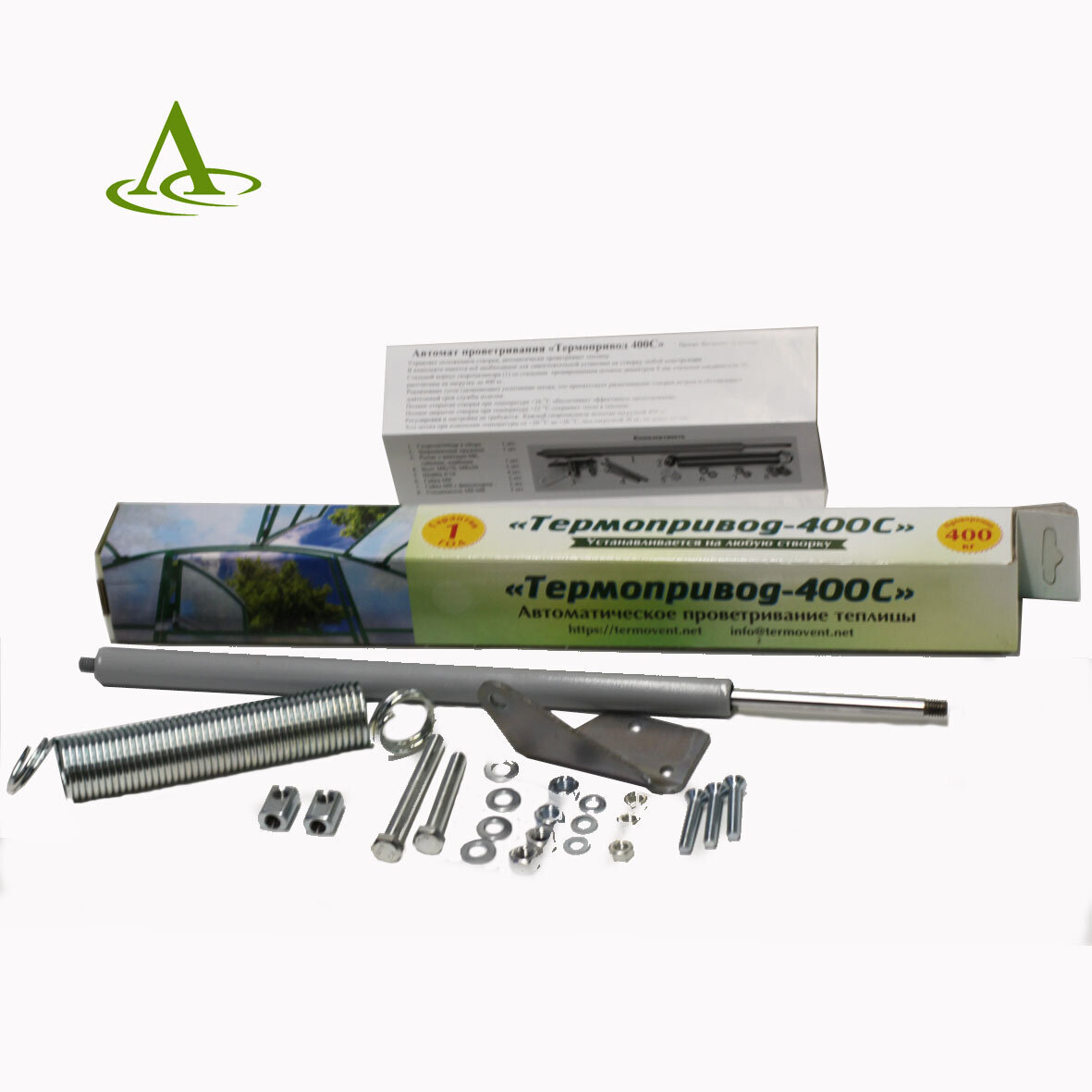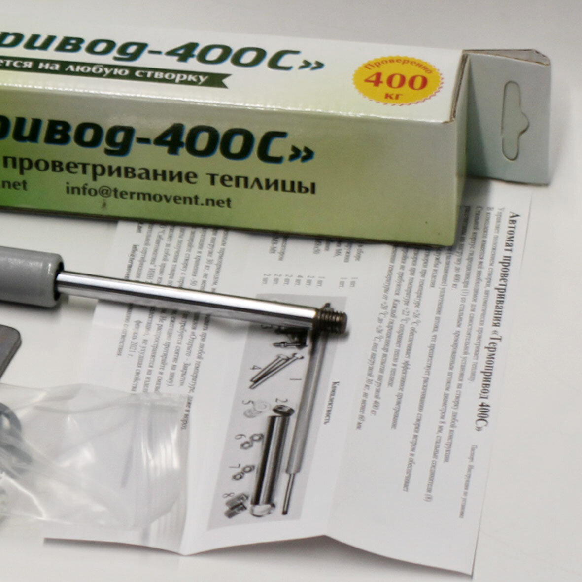 Автомат проветривания «Термопривод-400С» является универсальным - устанавливается на форточку, окно, дверь теплицы. Выдерживает мощную ветровую нагрузку. В качестве основы используется неразборный гидроцилиндр со специально реализованным тугим (залипающим) уплотнением штока. Это обеспечивает хорошую герметичность соединения, длительный срок эксплуатации уплотнений и предотвращает подвижность створки ветром. При температуре выше +22 °С гидроцилиндр выталкивает шток и открывает прикреплённую к нему створку окна, форточки, двери теплицы. Закрытие (утапливание штока в гидроцилиндр) происходит при снижении температуры от +26 °С с помощью пружины. Угловой кронштейн обеспечивает угол открытия створки от 60° до 80°. В термоприводе отсутствуют настройки и регулировки: скорость утреннего прогрева теплицы при восходе солнца делает нецелесообразными любые настройки температуры начала проветривания. Термопривод позволяет открыть створку, дверь вручную. В зимний период снятия не требуется.