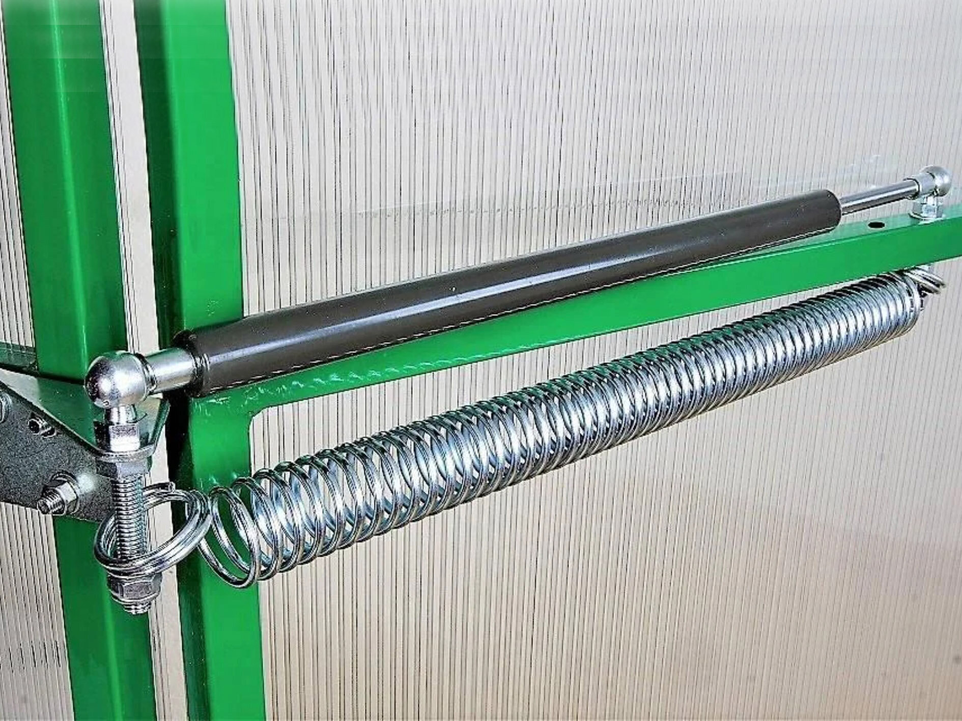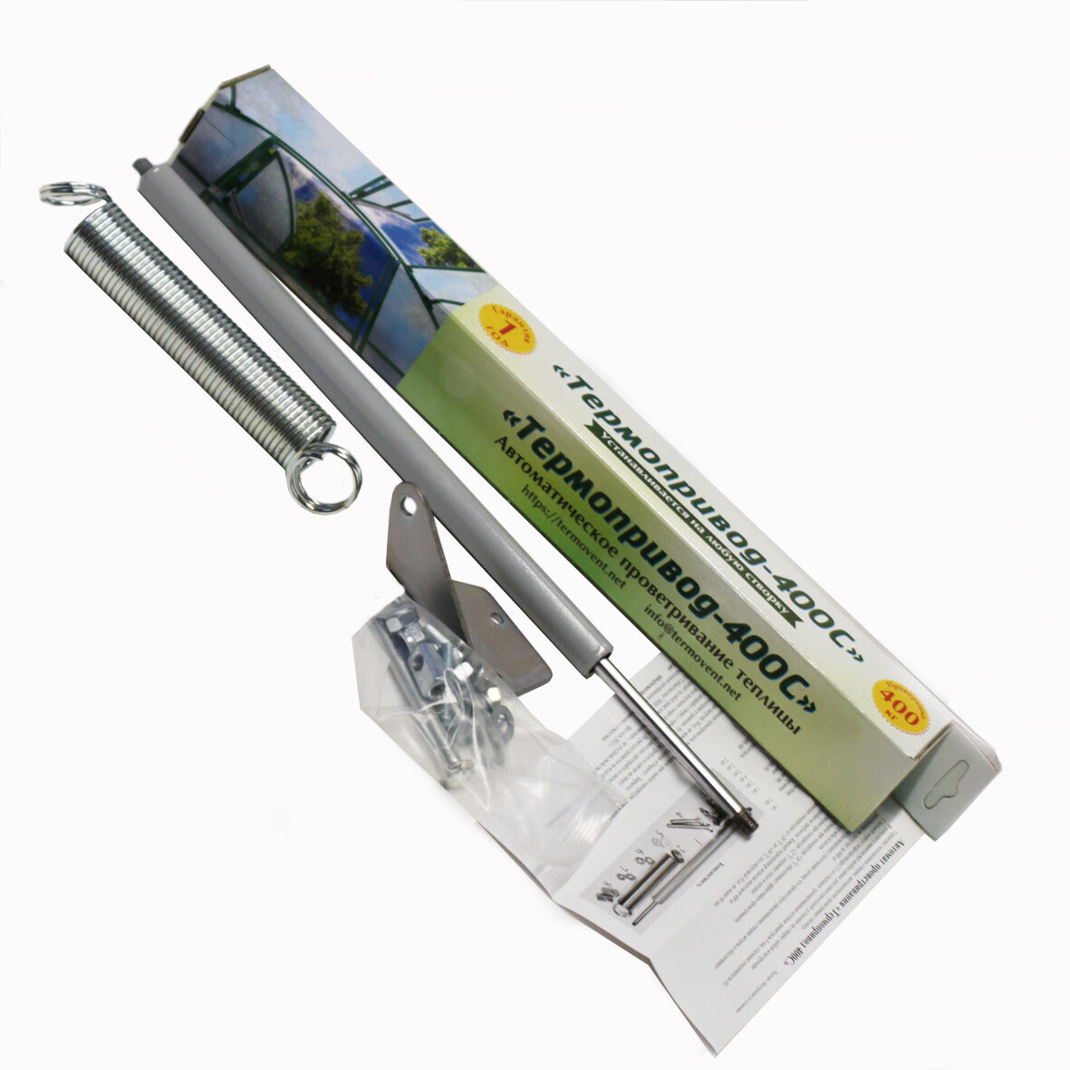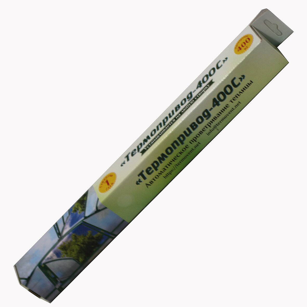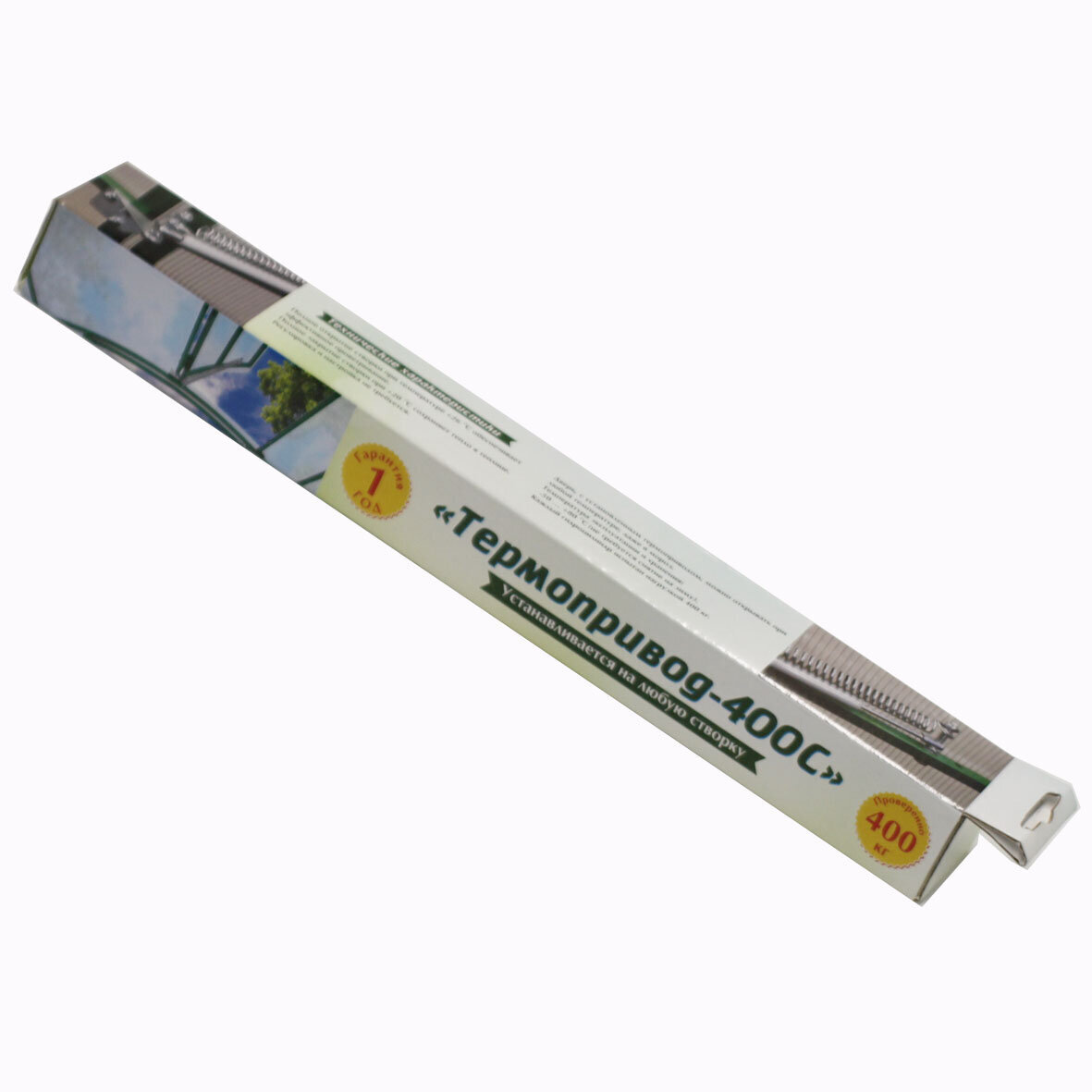 Автомат проветривания «Термопривод-400С» является универсальным - устанавливается на форточку, окно, дверь теплицы. Выдерживает мощную ветровую нагрузку. В качестве основы используется неразборный гидроцилиндр со специально реализованным тугим (залипающим) уплотнением штока. Это обеспечивает хорошую герметичность соединения, длительный срок эксплуатации уплотнений и предотвращает подвижность створки ветром. При температуре выше +22 °С гидроцилиндр выталкивает шток и открывает прикреплённую к нему створку окна, форточки, двери теплицы. Закрытие (утапливание штока в гидроцилиндр) происходит при снижении температуры от +26 °С с помощью пружины. Угловой кронштейн обеспечивает угол открытия створки от 60° до 80°. В термоприводе отсутствуют настройки и регулировки: скорость утреннего прогрева теплицы при восходе солнца делает нецелесообразными любые настройки температуры начала проветривания. Термопривод позволяет открыть створку, дверь вручную. В зимний период снятия не требуется.